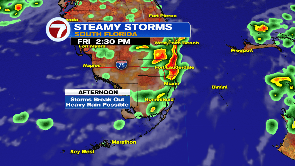 Hopefully everyone has had a great holiday week! Friday is finally here and conditions across South Florida remained the same through the entire week. Warm and muggy conditions in the morning have given way to steamy conditions each afternoon, as our feels-like temperatures have soared well into the triple digits. On Thursday, a few areas saw showers and thunderstorms, however, many areas also simply remained steamy through a big chunk of the day. This morning there were showers and thunderstorms over the Florida Bay lifting northward away from the Florida Keys but the storms fizzled before affecting any land areas.