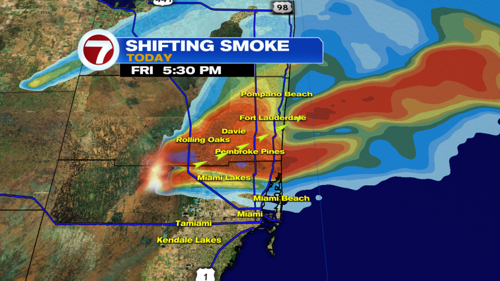 Tonight we’re expecting clouds to build across our area while areas of smoke could begin to affect our western suburbs of Miami Dade and Broward County as the wind pattern continues to change (which will also allow rain and thunderstorms to return to the forecast).