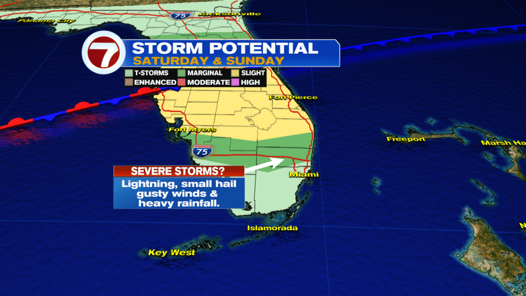 So while areas of smoke continue to impact our inland suburbs of South Florida, there could be light at the end of the tunnel. That silver lining will be that rain and thunderstorms will return to the forecast this weekend. If enough rain falls over western portions of South Florida (where we find the brushfires), then it may help put out the fires. The bad news is that as the front gets closer to South Florida it is forecast to stall just to the north of our area. This means that the threat for strong to severe thunderstorms will increase as we head into the weekend. Frequent lightning, gusty winds, small hail and locally heavy rainfall will all be possible impacts for South Florida with any strong to severe thunderstorm that does develop.