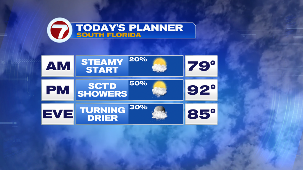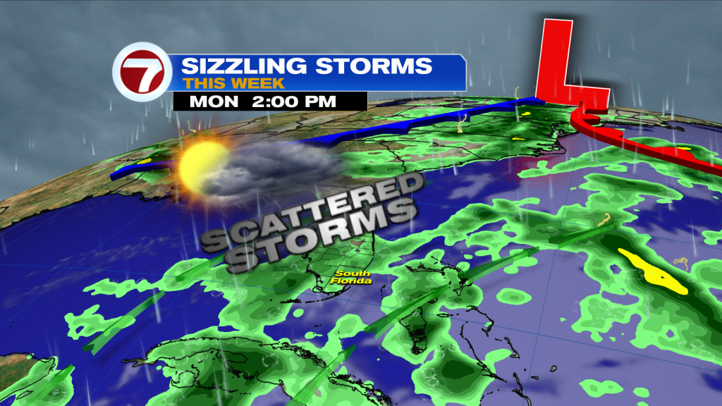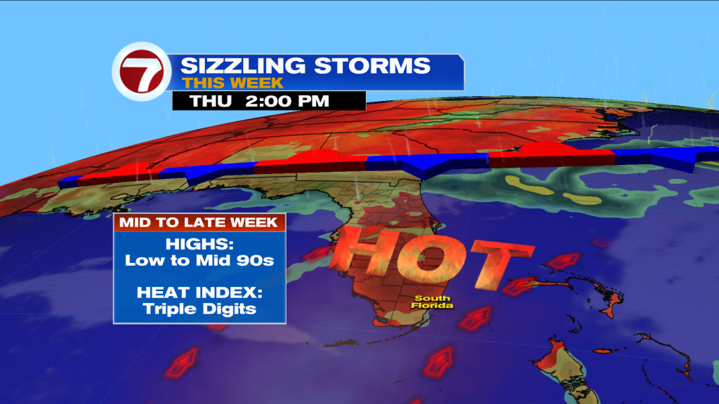 We’ll have one more day with a decent rain chance on Tuesday before drier air in the mid to upper levels gradually settles in, allowing for lower rain chances at a 30% chance. This means South Florida will see drier and brighter days but also warmer temperatures. Highs by the end of the week will hover into the low to mid 90s with feels-like temperatures likely in the triple digits.
