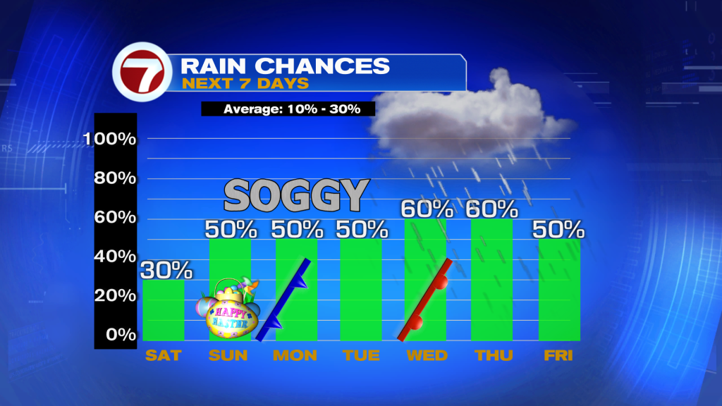 Due to the veering land breeze, that is going to put us in place for warmer temperatures on Sunday along with a higher rain chance. It is Easter Sunday so for those of you that celebrate and do the egg hunt, the earlier you do that the better. By the afternoon, clouds will begin to build while temperatures peak into the upper 80s. Then eventually those clouds will turn into showers and thunderstorms, some of which will be heavy, moving toward the east coast metro generally from the 3-9 pm time period.