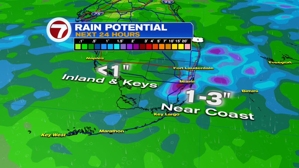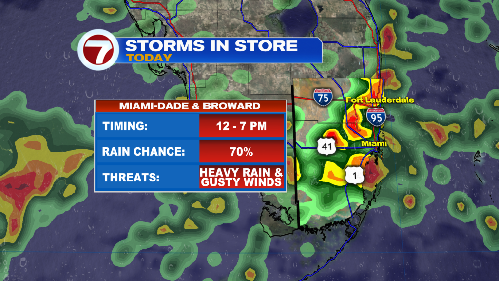 Since there is a little bit of sunshine out now, we could be looking at some stronger storms developing. Therefore, scattered to numerous showers and storms will likely get going between noon-7pm. It will happen in rounds and some of the storms could produce concerns for street flooding. Models picking up about 1 to 3 inches of rain near the coast.