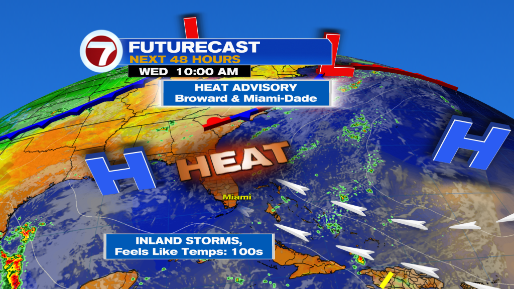 Today South Florida can expect more heat and humidity in the mix. An onshore flow (a wind off the water) will continue to usher in higher moisture, which will make temperatures feel warmer than the actual air temperature. A few sea breeze driven thunderstorms return to the forecast today before eventually pushing farther inland away from our metro. Our feels-like temperatures today will reach into the triple digits across all of South Florida once again and could range anywhere between 103° to as high as 110° across some areas! A heat advisory has once again been issued for all of mainland South Florida (which includes Miami-Dade and Broward) until 7pm.