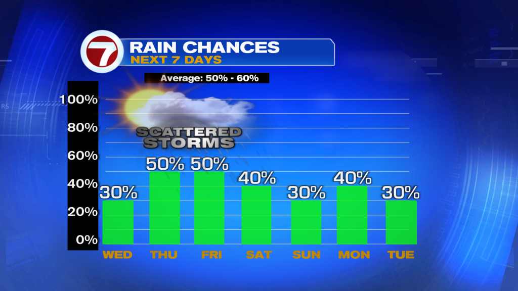 Looking ahead, a South to Southwest wind returns to the forecast and could usher in moisture associated with a westward-moving tropical wave in the Caribbean. This means that there will be a bit more available moisture for rain. So slightly higher rain and thunderstorm changes return for the latter part of the work week. By Friday & for the start of the weekend, steering winds will be out of the Southwest again, which means the best timing for showers and thunderstorms both days will be in the afternoon. Steamy temperatures return during this time while our feels-like temperatures continue to range between 105° to 110° – higher across some areas! A layer of Saharan Dust is forecast to reach our area by the latter part of the weekend, which could lower our rain chances again as early as Sunday!