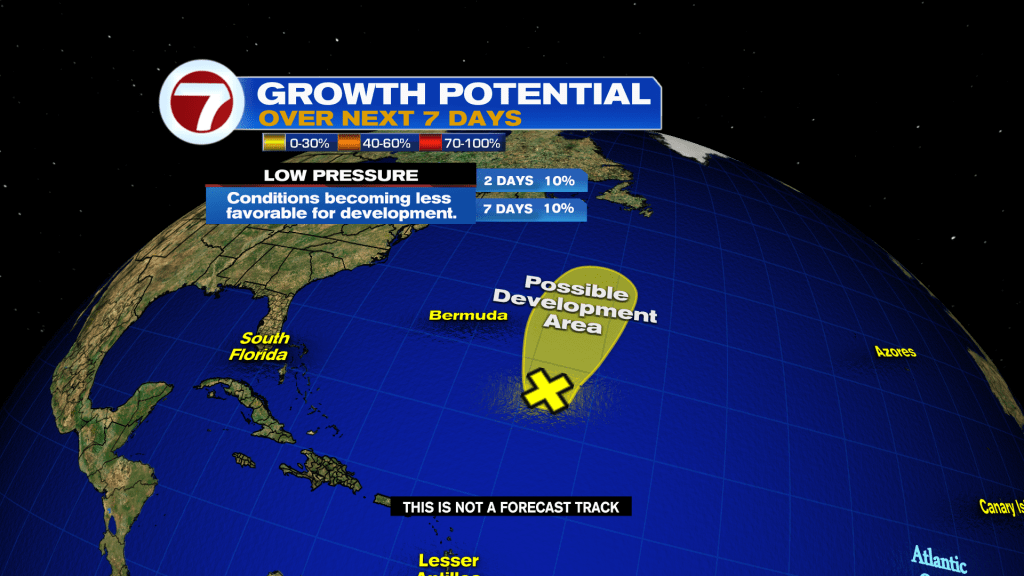 Showers and storms remain disorganized with an area of low pressure Southeast of Bermuda. Conditions are becoming less favorable for development. It has a low chance to form during the next few days.