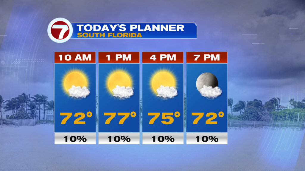 After quite a few, cool, cloudy and wet days here in South Florida, today we can expect a mix of sun and clouds to return to the forecast. And with just a little more in the way of sunshine, our afternoon high temperatures will once again warm into the mid 70s. With a northerly wind component still in place, we will continue to see nice conditions and comfortable humidity levels. Needless to say, other than a stray sprinkle. rain will not be an issue for South Florida today.