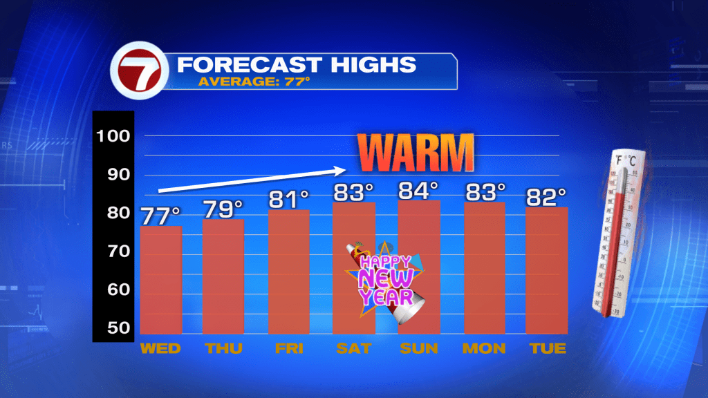 As mentioned above, New Year’s Eve in South Florida should be a quiet one. Here’s a closer look at what we can expect heading into the final days of 2022 and the start of 2023. Opposite of what we have been seeing, a Southerly wind will be in place and that’s going to allow our temperatures on New Year’s Eve to reach the low 80s in the afternoon. So as we ring in the new year, Our evening temperatures will likely be in the 70s with a warm breeze out of the South and a bit more in the way of humidity. The first day of 2023 looks like it could be a little warmer with afternoon high temperatures reaching into the mid 80s. The good news is that the New Years holiday does look mainly dry for South Florida.