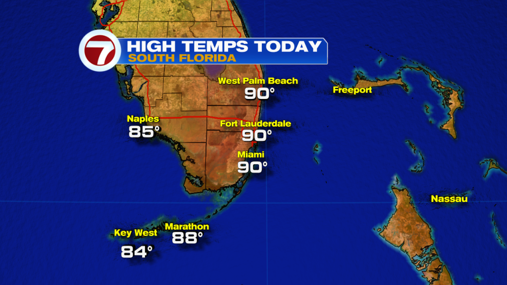 Hopefully everyone had a nice start to the weekend. Today was a mixed bag of weather across south Florida. We started off with steamy and sunny conditions and, as a matter of fact, our afternoon high temperatures across Miami and Fort Lauderdale both reached a record-setting 90°. But then a front approached South Florida and brought gusty showers across our area. Temperatures immediately began to drop behind the front as the wind veered out of the Northwest.