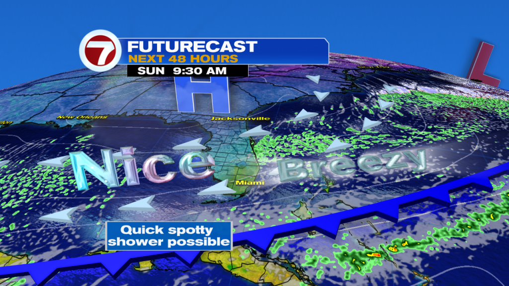 Sunday brings more changes as we go about our day. The wind direction will quickly veer off the water leaving a brisk northeast breeze across South Florida. This means that a few passing clouds and possibly a spotty shower or two will be possible at any given time. After a cool start to the day in the 50s, our afternoon high temperatures on Sunday will reach a comfortable mid 70s. Once again due to the strong breeze in place, it could feel cool outside at times, especially when clouds roll in.