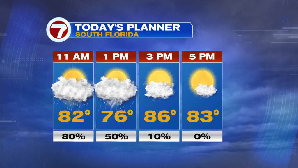 Now once this line of storms and clouds clears offshore by the mid afternoon hours, skies will gradually clear and that should allow for temperatures to warm back up into the mid 80s following the rain-cooled air. The breeze will gradually lessen after sunset and also lower humidity will also begin to flow in.