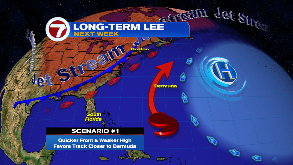 Scenario 1: Quicker front and weaker high pressure would favor a track closer to Bermuda.