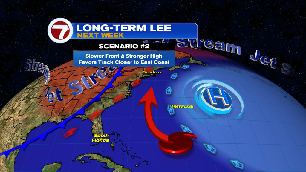 Scenario 2: Slower moving front and stronger high pressure would favor a track closer to the U.S. East Coast.