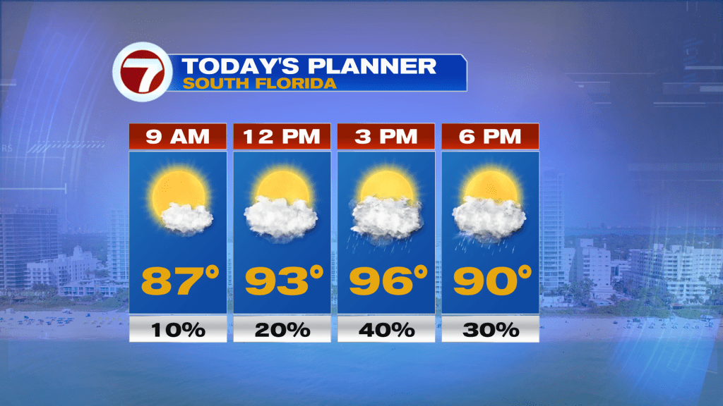 This will drive high temperatures up and into the mid to upper 90s across most of South Florida Saturday through Monday. This heat will also be worsened thanks to Saharan dust filling our skies, allowing more sunshine. This dust will keep rain chances low throughout the weekend but it won’t be completely dry. Expect lots of sunshine Saturday morning, then the chance for an afternoon storm or two.