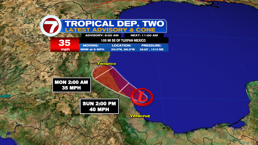 Tropical Depression Two formed over the Bay of Campeche on Saturday. It is forecast to intensify into a tropical storm Sunday before moving into eastern Mexico by the end of this weekend, leading to heavy rainfall and gusty winds.