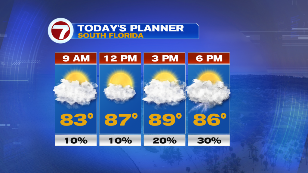 Therefore, expect mostly cloudy skies but still some peeks of sunshine. There will be the chance for some spotty showers during the day but the highest potential for seeing rain — which isn’t that high of a chance — will be this evening in the form of isolated showers and storms, especially inland.