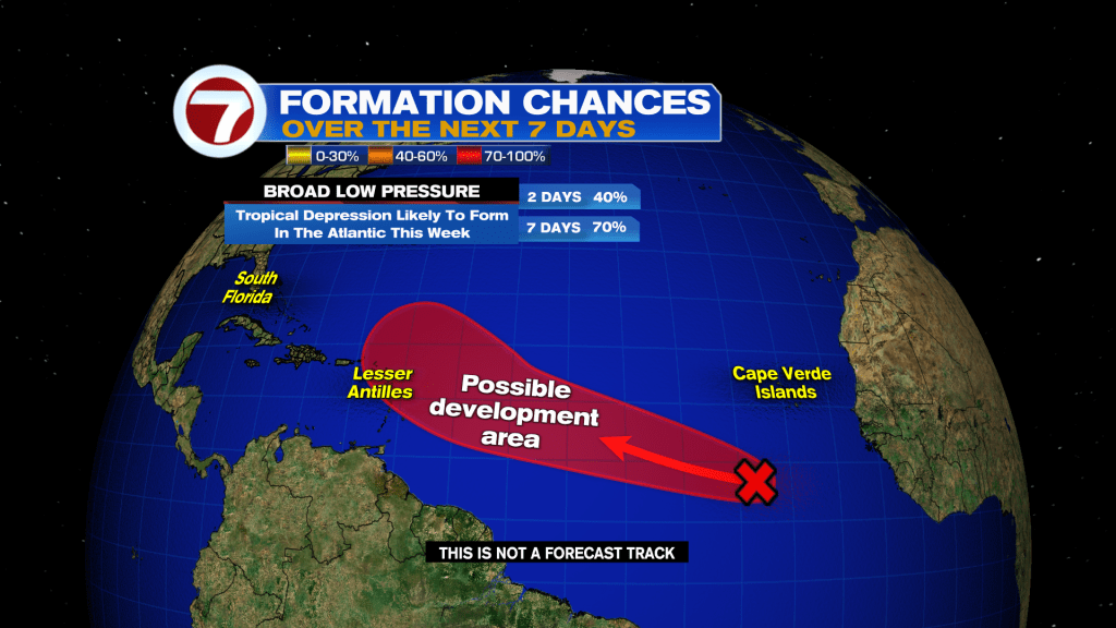The National Hurricane Center is monitoring one feature in the tropics for potential tropical development. It’s a broad area of low pressure over the eastern Atlantic Ocean, which has a 70% chance of forming within the next 7 days. It will be worth watching for the Leeward Islands over the course of this week.