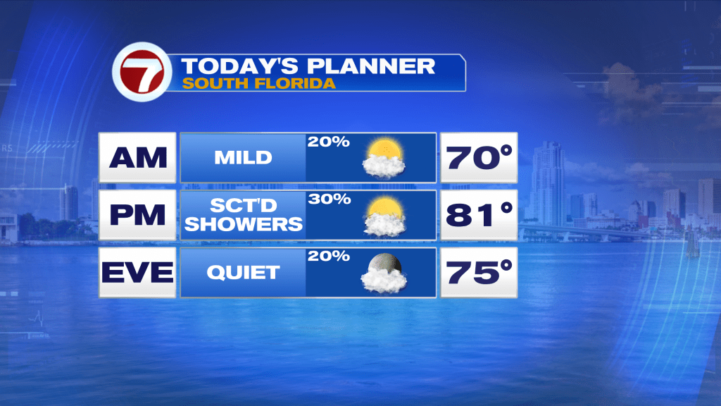 Up and down temperatures will be the name of the game for South Florida for the rest of the work week. Temperatures in the mid 80s will be possible Wednesday as a South wind brings a surge of warm air. This will be ahead of another front that is forecast to push through South Florida by early Thursday. Instead of the mild temperatures we saw with Monday’s front, some areas could even see upper 50s to lower 60s on Friday morning. Unlike its predecessor, this front is a bit stronger and will keep our comfortable temperatures in the 70s through the upcoming weekend. Speaking of the weekend, clouds will build across South Florida and a few showers return to the forecast by Sunday.