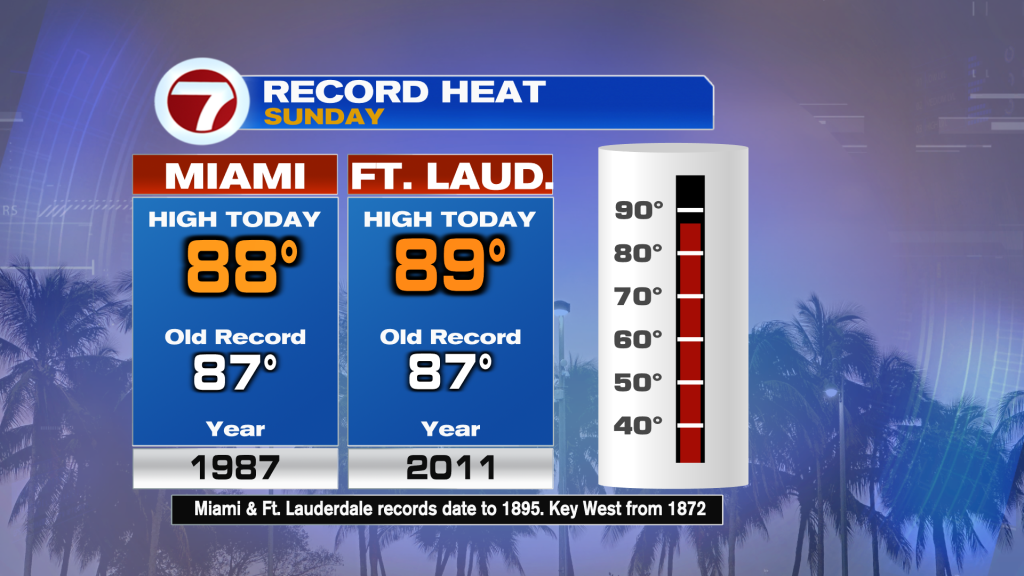 Recent warming peaked on Sunday with record heat in both Miami and Ft. Lauderdale (nearly hitting 90-degrees)! It was a summer preview and something we’ll get used to feeling, in about 3 months.