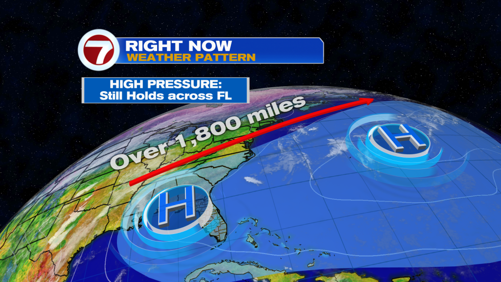 So far this week, very steady weather has been in place. The reason? A large area of High Pressure, and Florida has been on the western edge of it. It’s worth a look at the huge span of the High. The distance, in miles, is an impressive 1800 miles across (from one High Center to the next).