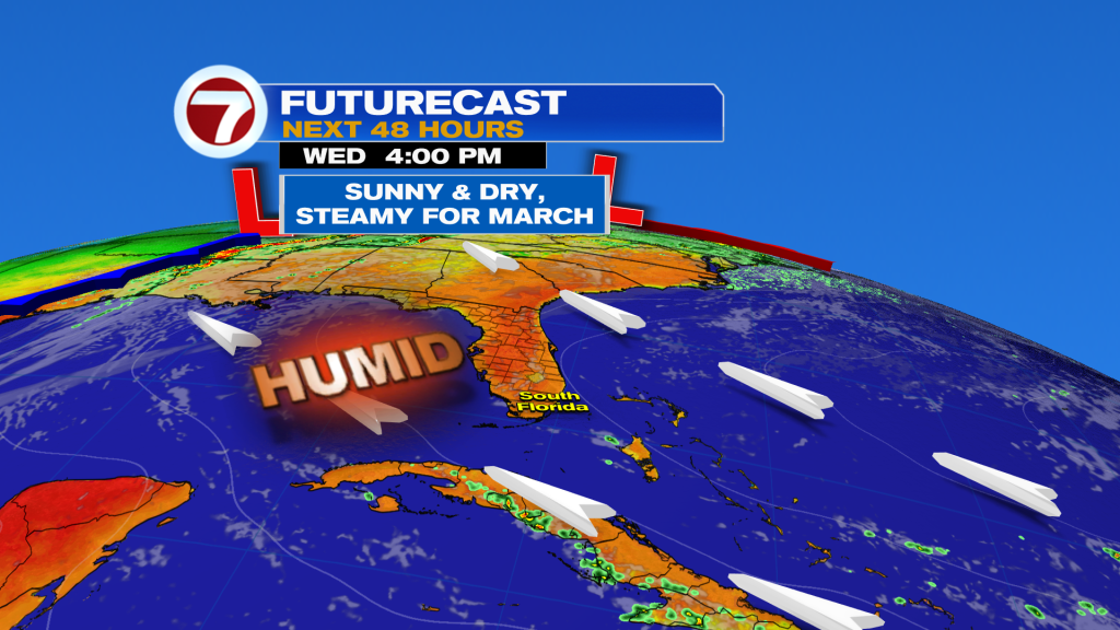 In south Florida, we’ll have another day (on Wednesday) with tranquil and dry conditions. It’ll feel warm with more humidity as winds veer from the southeast. This is shown below, on the weather map.