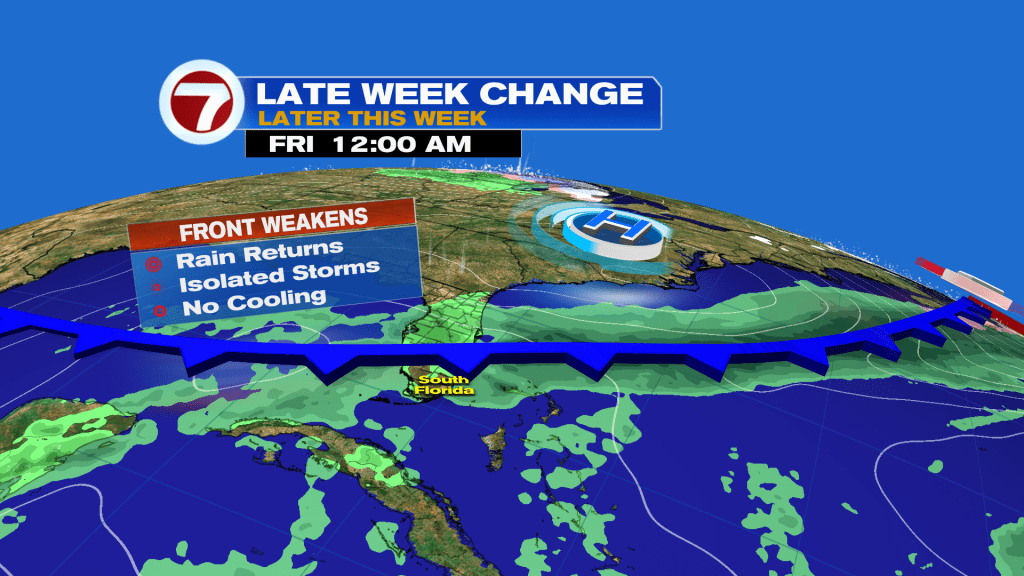 The Front is forecast to reach south Florida late Thursday night into Friday morning. The latest model data supports the idea of rain arriving in a couple of batches. The first chance for downpours could arrive Thursday afternoon (ahead of the boundary). Then, another push of rain and storms is likely to form on Friday, even after the passage of the front. Keep in mind, rain will stay in the forecast into the weekend. See the channel of “green” future rain that extends well into the Atlantic? It’ll get drawn our way around the base of “new” High Pressure from the Eastern Seaboard (North Carolina vicinity).