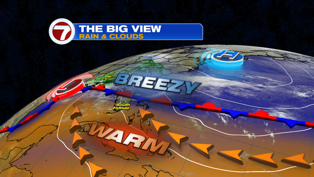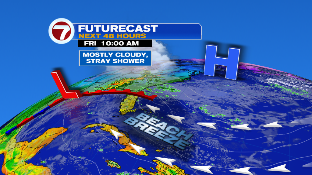 Today and tomorrow will be fairly similar days with mostly cloudy skies and a stronger breeze out of the southeast. Every once in a while, a spotty shower could get steered onshore but overall it will be dry during this time period.