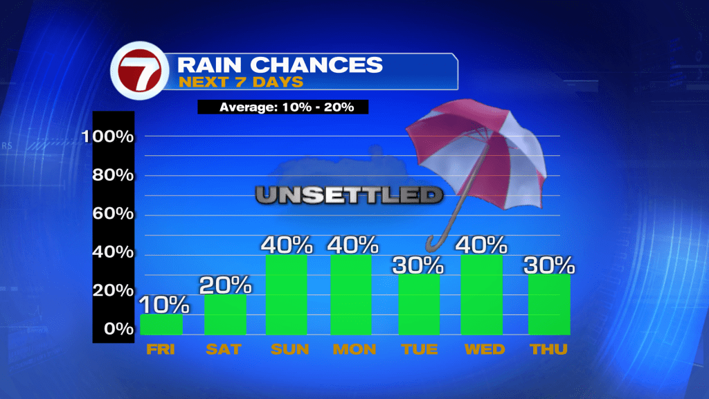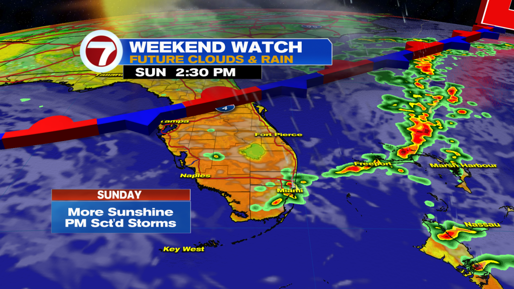 Now by Sunday, we’re going to start to see changes as a front becomes stalled across northern and central Florida while pockets of moisture get steered in from the Gulf of Mexico. This will lead to the daily chance for scattered showers and thunderstorms during at least the early to midweek time periods of next week.