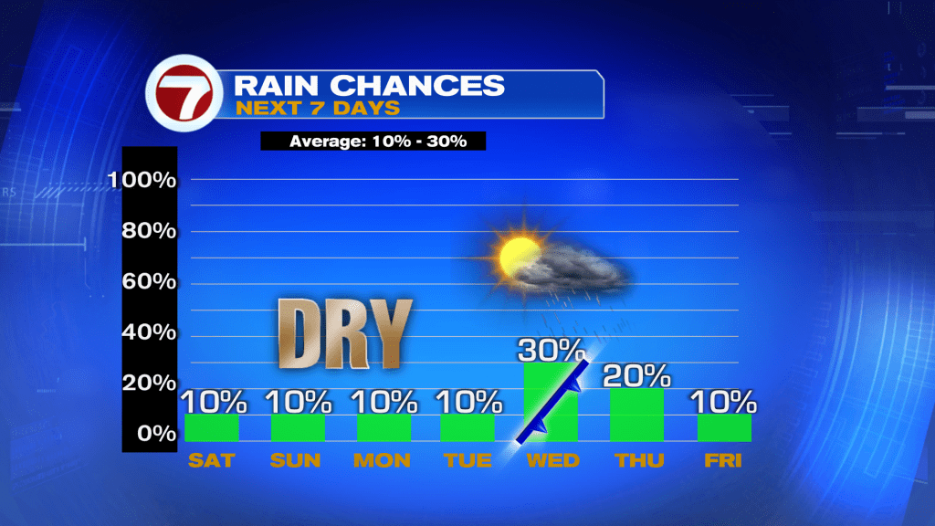 This weather story will hold true for Sunday as well to complete the weekend with partly cloudy to mostly sunny skies, highs in the mid to upper 80s and a low rain chance. The warmth and sunshine will continue through Tuesday into the upcoming week with highs near 90F ahead of a weak front.