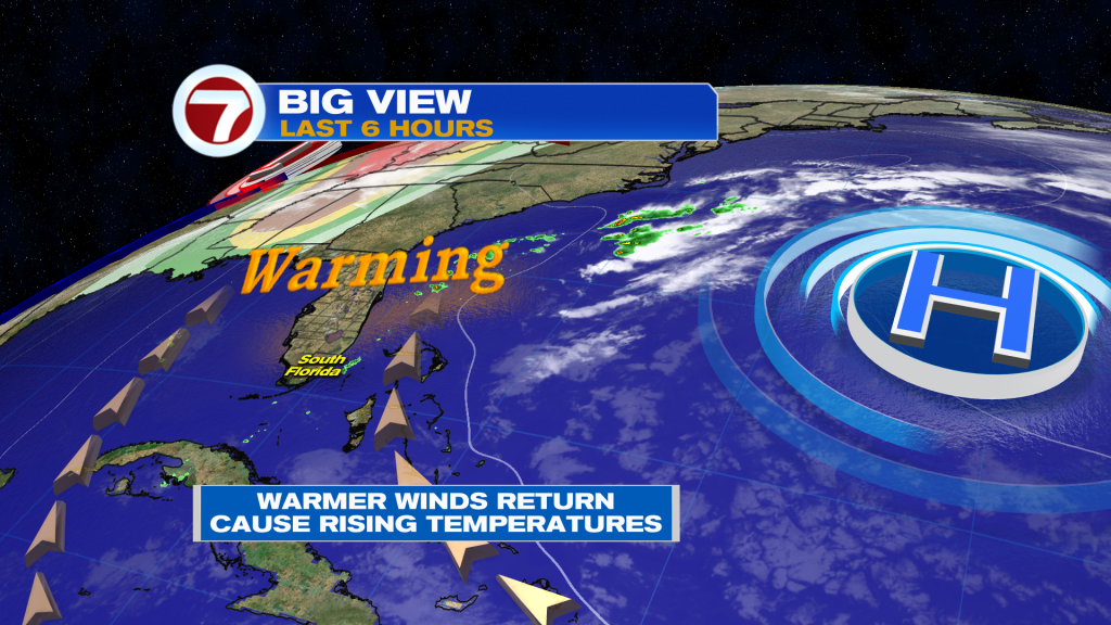 Hopefully everyone had a great week. South Florida got really lucky as we enjoyed very comfortable conditions and a very quiet pattern through much of the week. But as the week went on, South Florida began to notice very subtle changes. It may not seem like it, but a warming trend has been underway since earlier in the week but since it was so subtle, it was difficult to notice day-to-day. This morning, we truly felt the difference as we woke up to milder conditions with temperatures mostly in the 60s and 70s and a touch more humidity. The reason? The area of high-pressure that has been keeping things quiet continues to shift farther into the Atlantic, causing our wind direction to change.