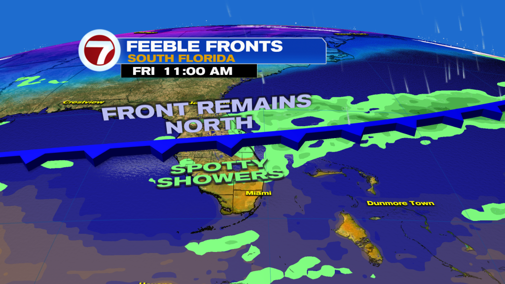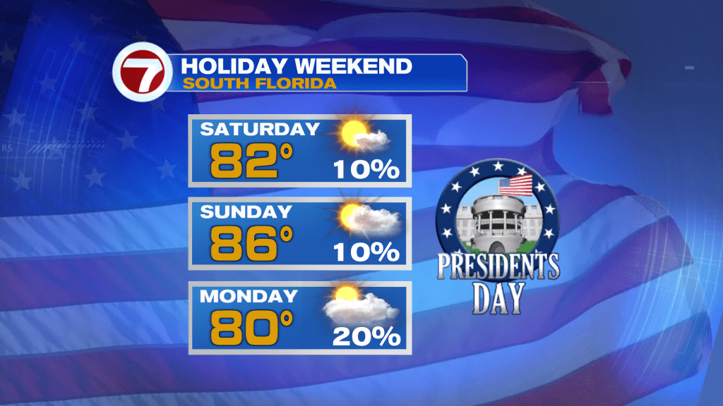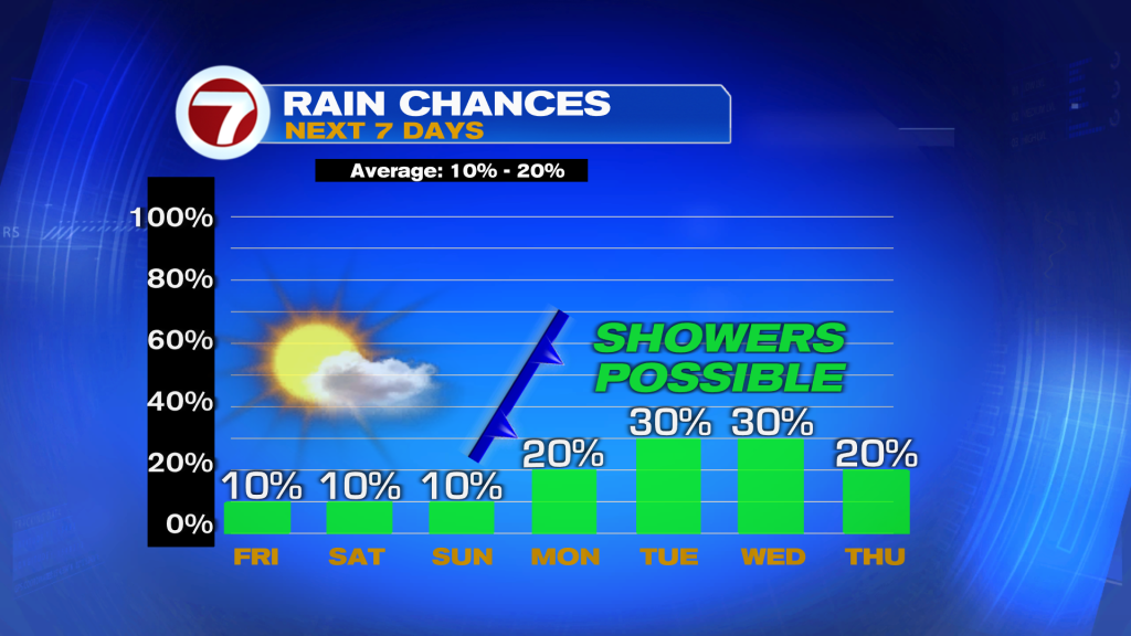 Rain chance stay fairly low for the holiday but with mostly cloudy skies. It’s not until mid next week when isolated to scattered showers return to the forecast.