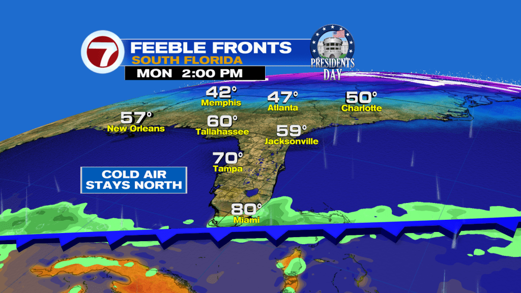 Then by Presidents’ Day on Monday, the second front associated with that cross-country system will arrive. It will clear through just to our south during the morning hours and will cause winds will veer out of the northeast. That will allow for slightly milder temperatures but there won’t be a chill like how it will play out farther north.