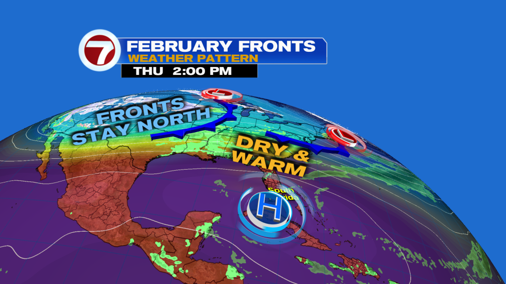 Looking ahead to next week, high pressure is forecast to build across Florida. This is going to block any cold fronts from coming down, and will send our temperatures soaring into the mid-80s by late in the week. The potential for record heat is increasing as a result.