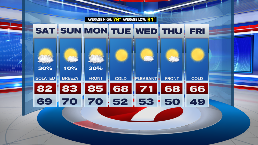 For Saturday, expect warm conditions overall with lows in the upper 60s followed by highs in the low 80s. That will be paired with sunshine, patchy clouds and a shower in spots.