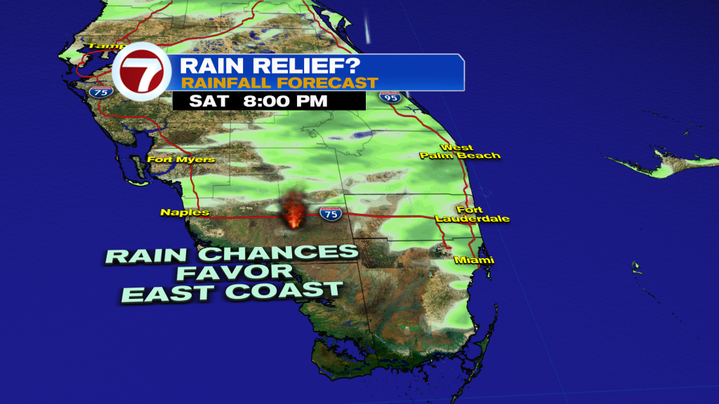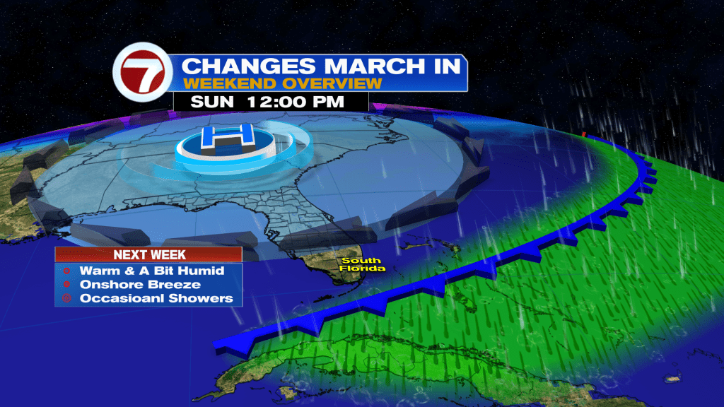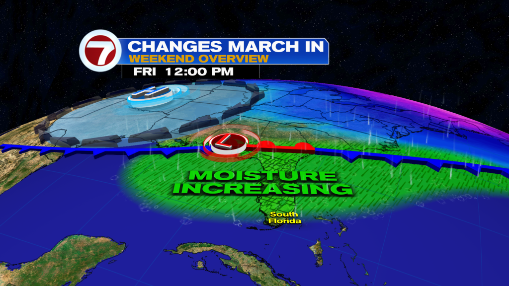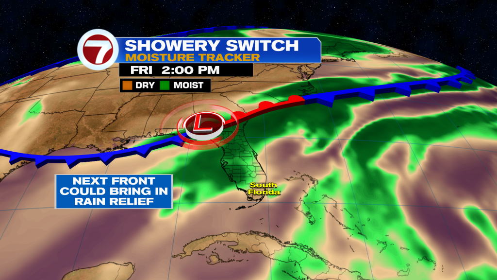 Rain chances then ramp up briefly come Saturday afternoon. A weakening front moving in from the north along with elevated moisture levels and a westerly steering flow will favor scattered, afternoon showers and thunderstorms across Miami-Dade and Broward.