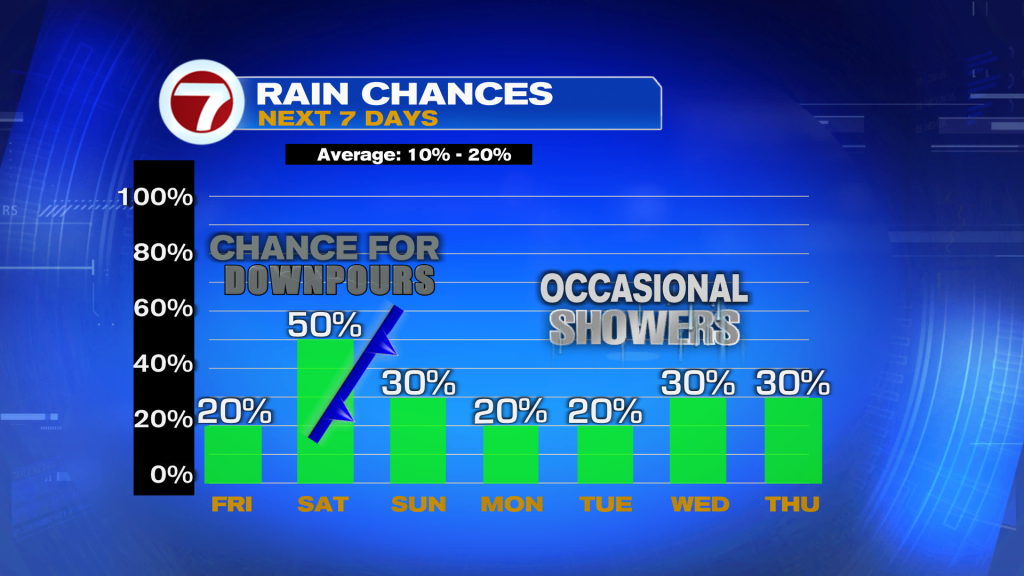 Beyond Saturday, we’ll turn relatively drier but there will be the daily risk for the occasional passing shower Sunday and throughout next week. Otherwise, it will be warm, more humid and breezy next week.