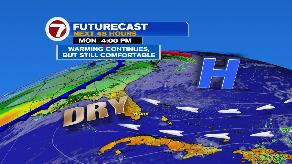 As we work our way into the start of the week, the area of high-pressure that has kept South Florida weather quiet and comfortable, will continue to shift farther east into the Atlantic. As it does so, the wind direction across south Florida will turn out of the southeast throughout the day on Monday. This will help trigger the warming trend that we have been talking about for days now. High temperatures across many South Florida locations will reach the lower 80s once again. But with plenty of dry air in place and storm systems far removed from South Florida, the weather pattern should still remain quiet and dry for South Florida to start the week.