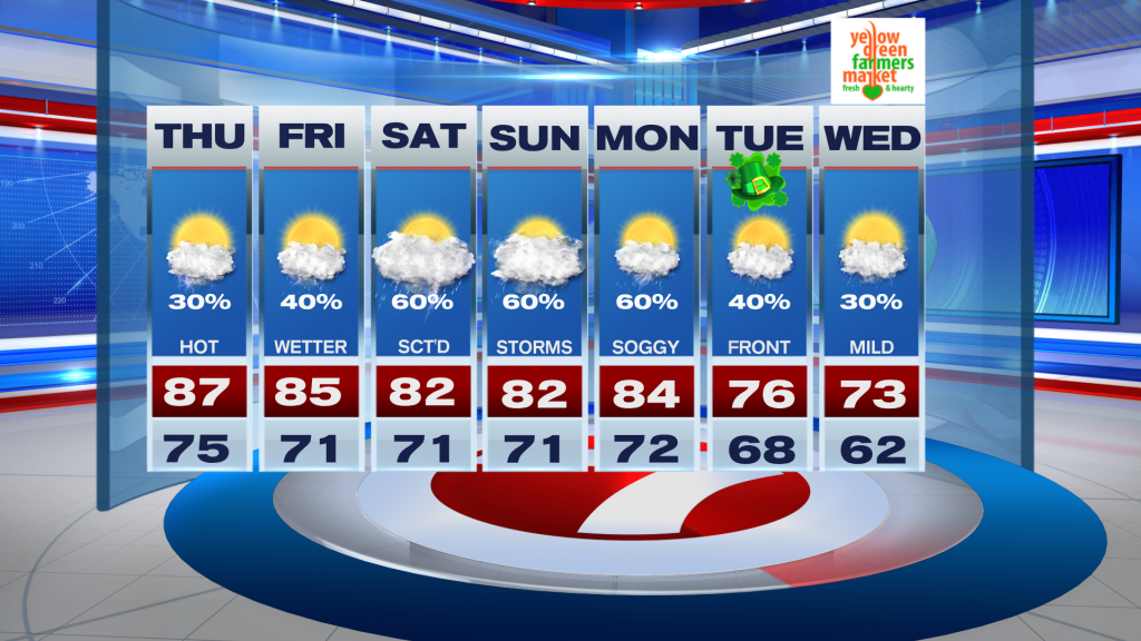 Rain chances increase on Friday as deeper moisture moves into the area as a weak front approaches. This setup will allow for more widespread showers and storms during the afternoon and evening, especially inland where sea breezes collide.