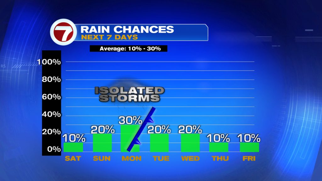 Rain chances rise ever so slightly on Sunday as there will be a little bit more moisture for the sea breeze to squeeze out a shower or two during the afternoon and evening hours. Otherwise, Sunday will basically be a copy-and-paste forecast of Saturday.