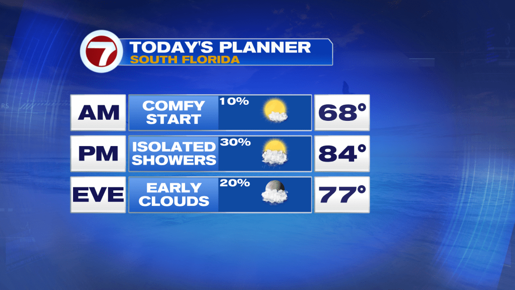 After a few afternoons with very comfortable temperatures, today promises a brief warm-up as we work our way into the afternoon. Afternoon high temperatures will be reaching into the mid 80s with a possibility of a few afternoon showers moving towards the East Coast. Our steering flow (the winds that steer showers and storms) will be out of the west because a front will be drifting south across the state and will be moving in our direction. Wind speed will be lighter today compared to previous days and that’s also going to allow our temperatures to be on the warmer side. And unlike yesterday, South Florida can expect a little more in the way of sunshine until the shower activity develops.