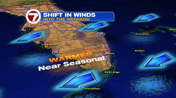 Cool/dry air from the north will start to shift out of the east and southeast by the weekend as high pressure moves over the Western Atlantic. As a result, our wind will tap into more warm/humid air and bring more seasonal temps back to South Florida as highs max out in the 80s under mostly sunny skies.