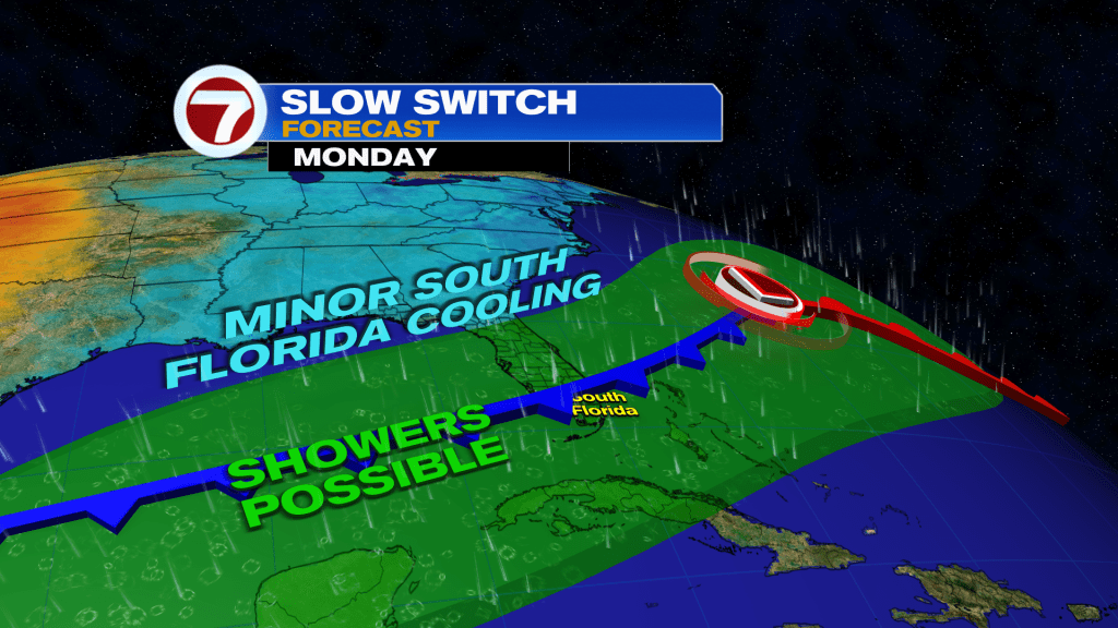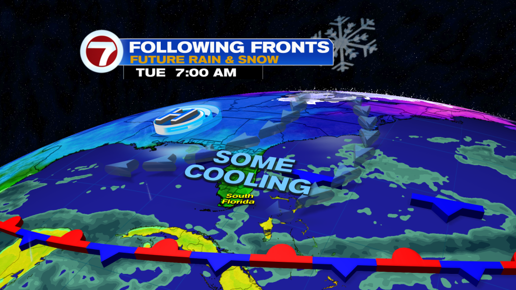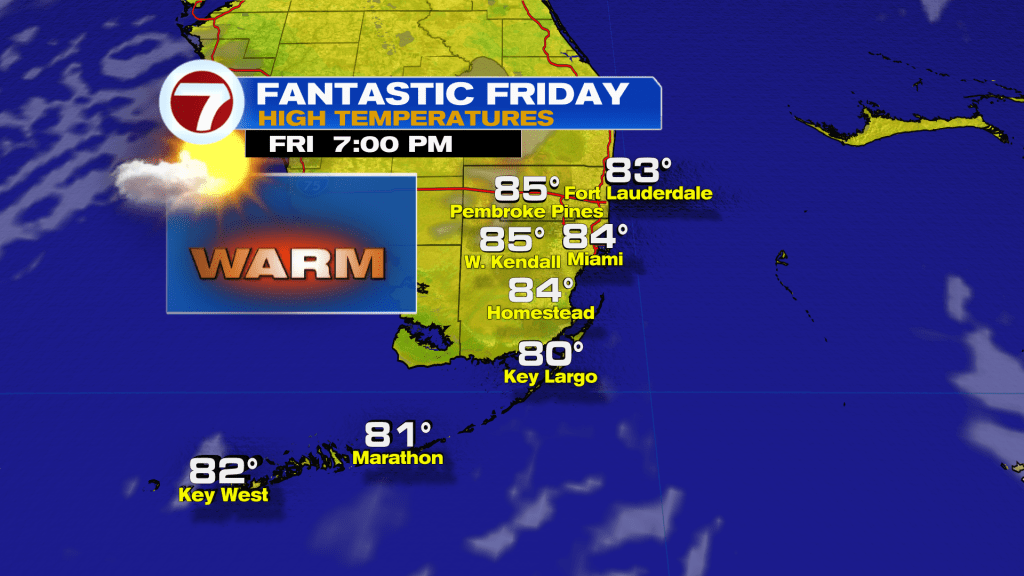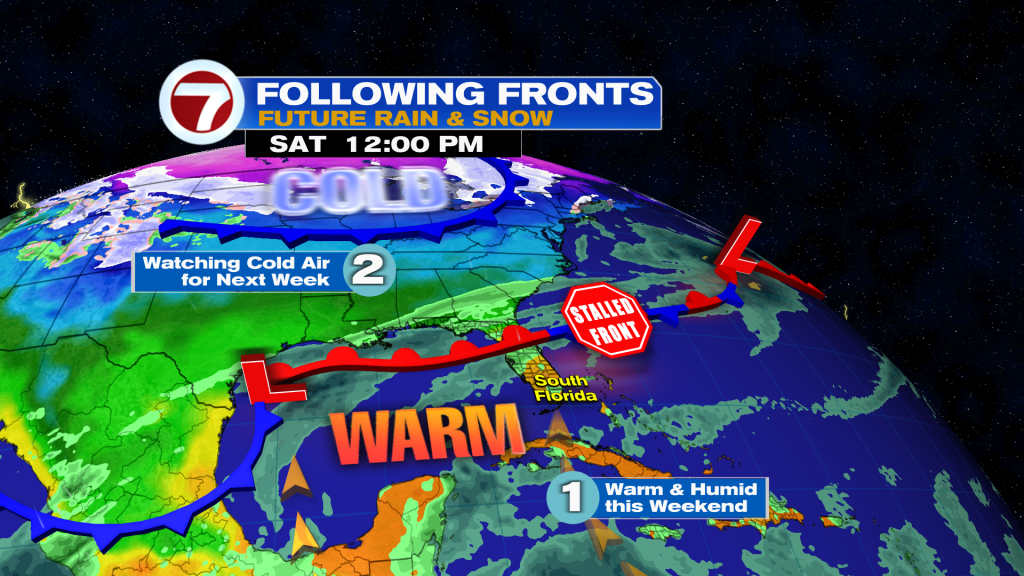 Temperatures will continue to climb into the weekend courtesy of winds flowing out from the south while the active storm track and fronts stay stuck near the Gulf Coast and Southeast. So while the Florida Panhandle will be cool and rainy to start the weekend, South Florida will be warm, bright and dry.