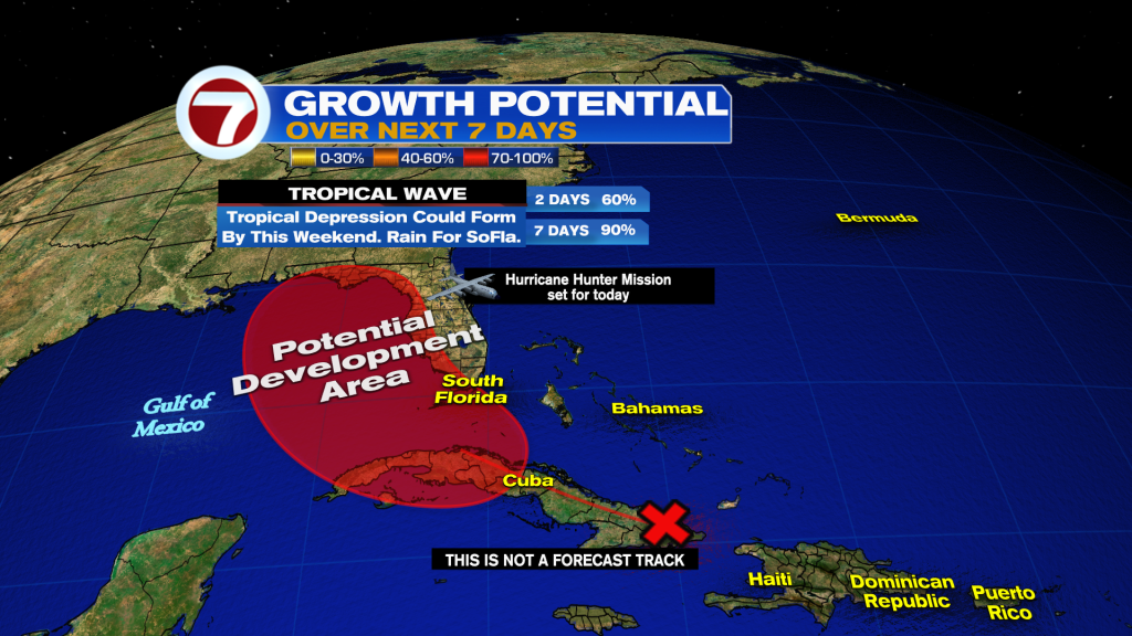 A tropical wave is producing a large area of showers & storms from Eastern Cuba, Hispaniola, & Southeastern Bahamas. A depression could form over the Straits of Florida or Eastern Gulf of Mexico this weekend. Hurricane Hunter mission set for later today.