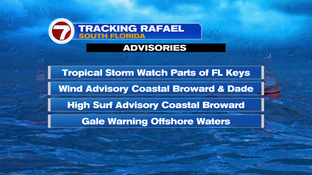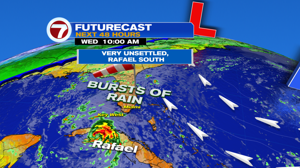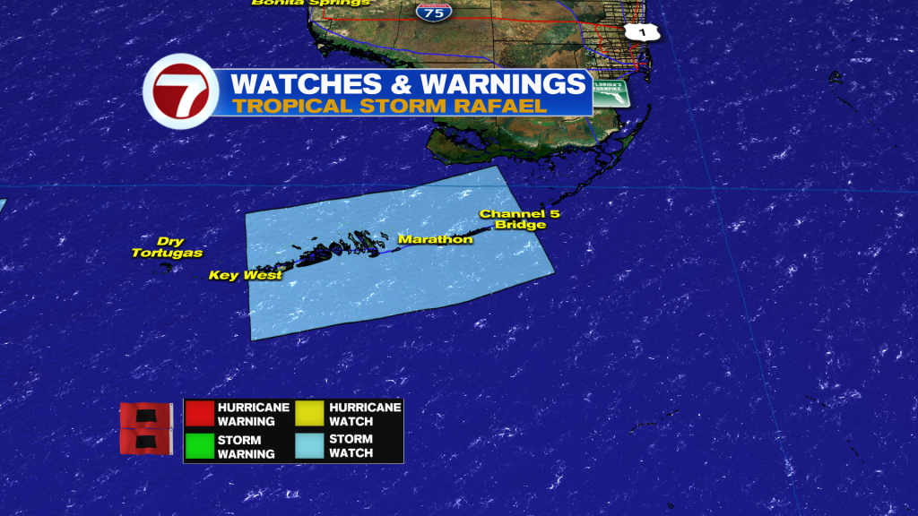 The probability of experiencing Tropical Storm-force winds (39+mph) is going up between a 30-50% for the middle to lower Florida Keys. That is why a Tropical Storm Watch is in effect. Stronger winds & heavier periods of rain expected Wednesday afternoon in the watch area. The watch is effect from West of the Channel 5 Bridge to Key West, including the Dry Tortugas. No direct hit is forecast from Rafael, but Tropical Storm conditions are possible in the Lower & Middle Florida Keys beginning late Wednesday or Wednesday night.