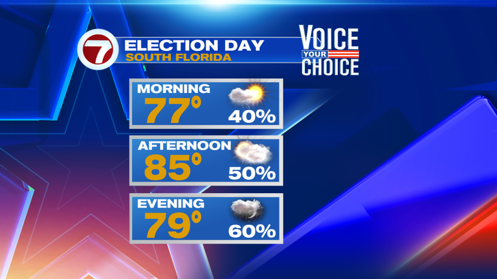 As you voice your choice today on Election Day keep in mind that it will be mostly cloudy with strong winds out of the East driving an occasional downpour through tonight. Highs in the low to mid 80’s.