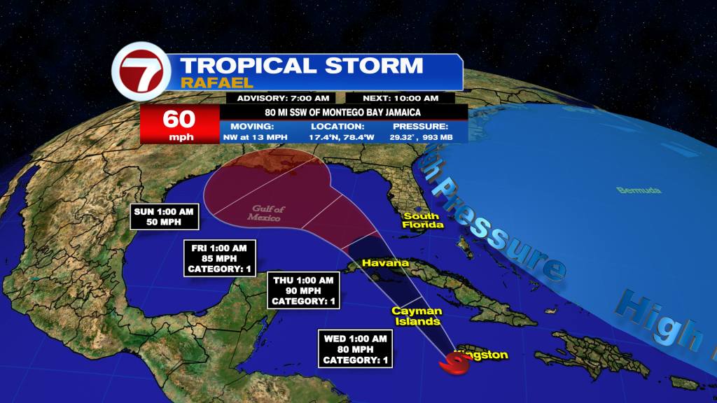 On the forecast track, Rafael is expected to move near Jamaica this morning, be near or over the Cayman Islands tonight, and be near or over western Cuba on Wednesday.