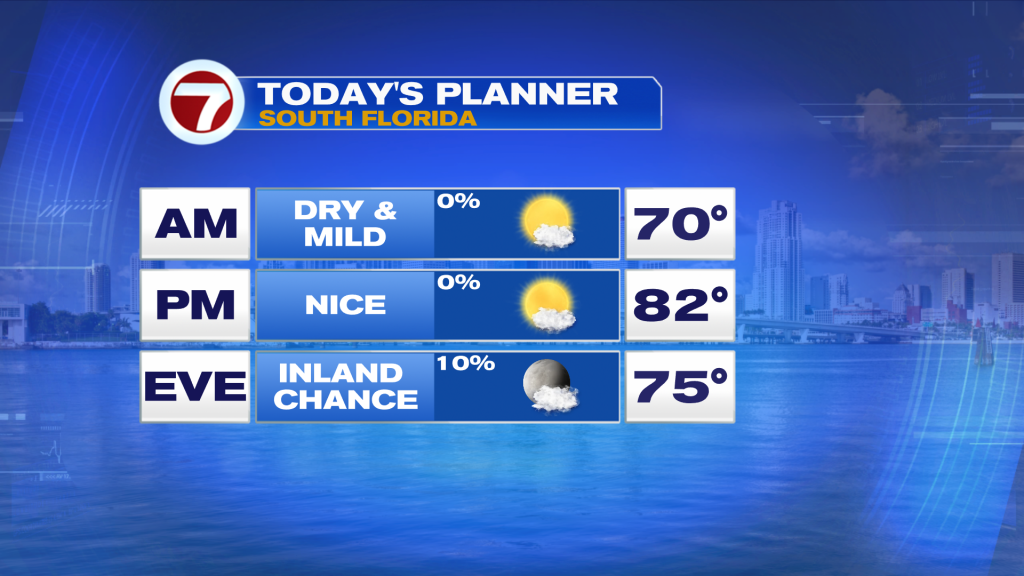Today will be a lot like what South Florida has seen every day for the last week. Mild morning temperatures in the upper 60s to low 70s will eventually give away to afternoon high temperatures in the mid to mostly lower 80s. And even though temperatures remain above average, humidity levels are still somewhat comfortable so the air does not feel too heavy. And it looks like the drier weather pattern that we have enjoyed through the last week will also continue as rain will not be a concern for us today as we start the new work week. Late afternoon and early evening a spotty shower will be possible across interior sections of South Florida and a few of those could skirt western suburbs of Miami-Dade & Broward.